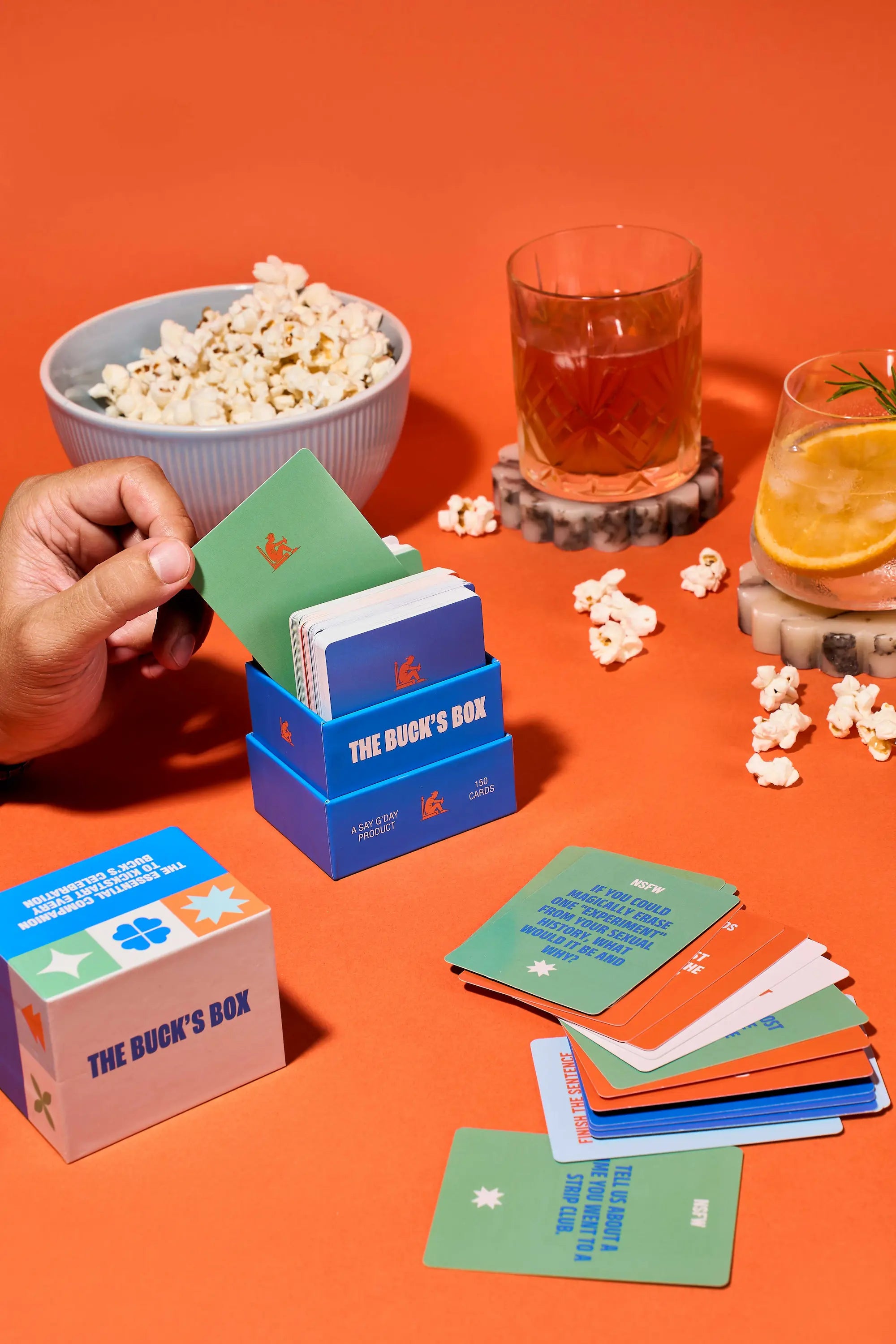 The Buck's Box features adult humour appropriate for men aged 22-40 at bucks parties. Cheeky and fun without being crude - the perfect balance of banter and genuine bonding.